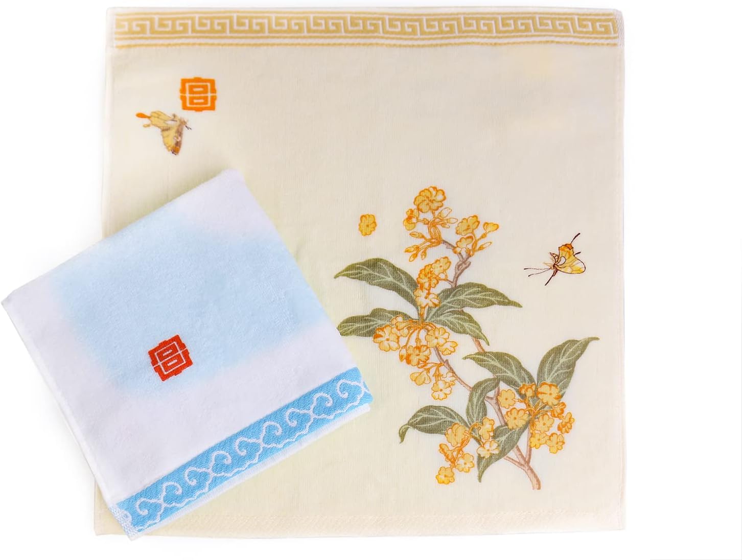 2-Pack Pure Cotton Square Face Towel Hand Towels, Chinese Style Imperial Garden Pattern Facial Cleansing Cloths, Ultra Soft and Gentle Washcloths for Bathroom, Size 14.