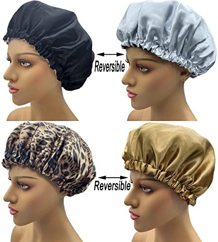 2 Pcs Satin Bonnet Hair Bonnet Reversible Comforable Silky Black Leopard Bonnet For Curly Hair Silky Bonnet For Sleeping Satin Hair Wrap Sleep Cap (Black+Leopard)