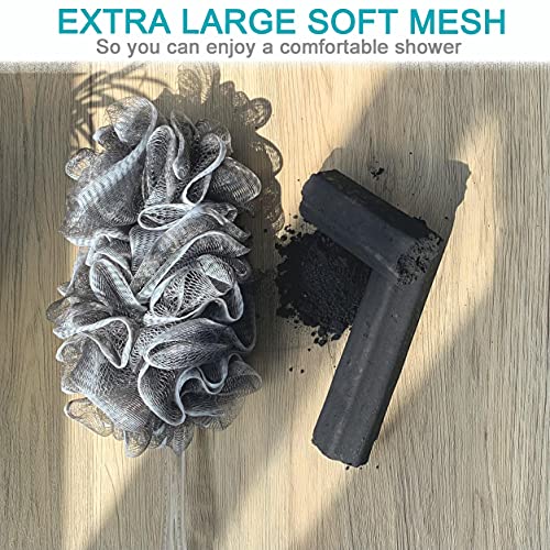 2 Pcs/Set Bamboo Charcoal Exfoliating Loofah Bath Back Brush On A Stick – Long Handle With Radian Is Ergonomic For Men And Women – 1 Shower Sponge Body Back Scrubber And 1 Shower Sponge Pouf Mesh