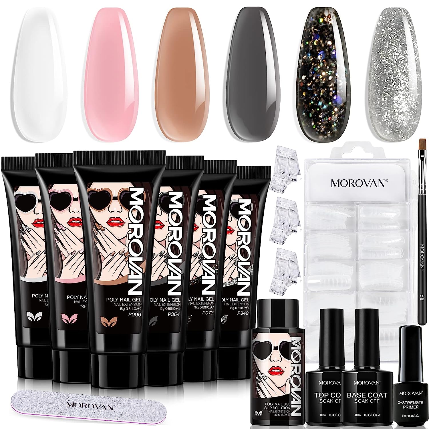 All in One Kit: This kit comes with everything you need for a salon-quality dip manicure . You will get 16 stunning colors of nail dip powder (0.34 oz. each), 4-piece dip powder liquid set (with base coat/top coat/activator/brush saver. 0.34 oz. each), 2 additional professional dip manicure tools (with powder brush/Nail Buffer)