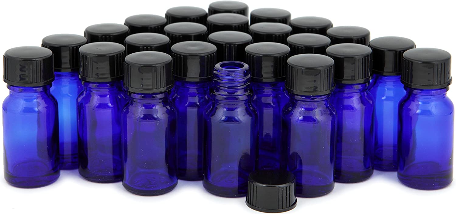 These high quality cobalt blue glass bottles with black lids, are perfect for storing your essential oils, perfumes or colognes.