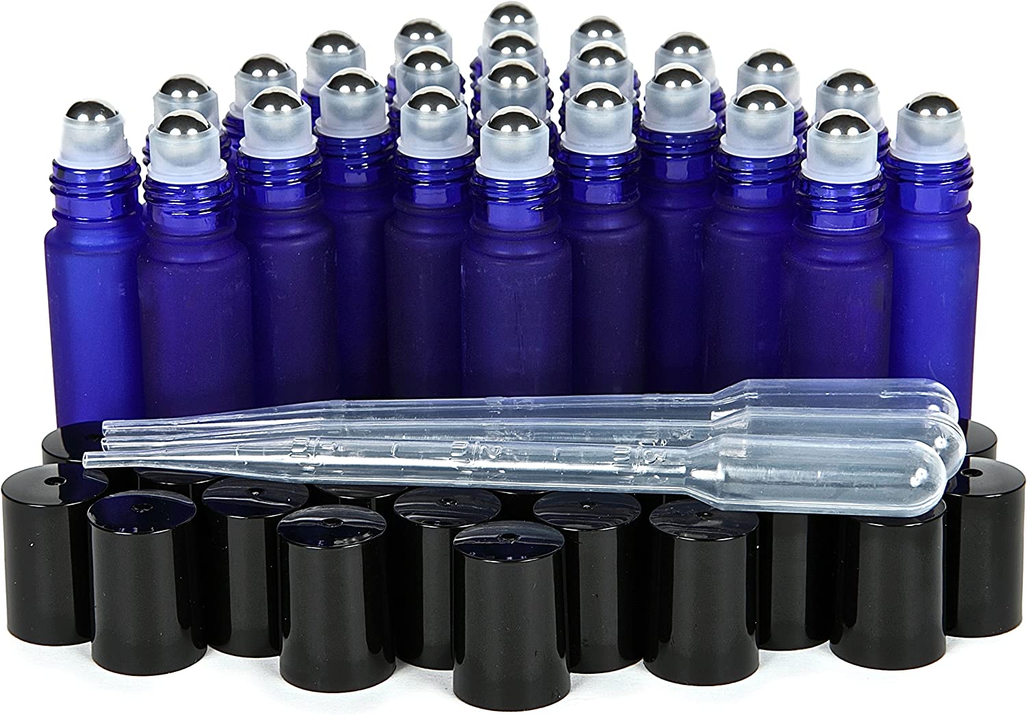 These high quality, Frosted Cobalt Blue Glass Roll-on bottles with stainless steel roller balls are perfect for use with essential oils, perfume oils, and other liquids.