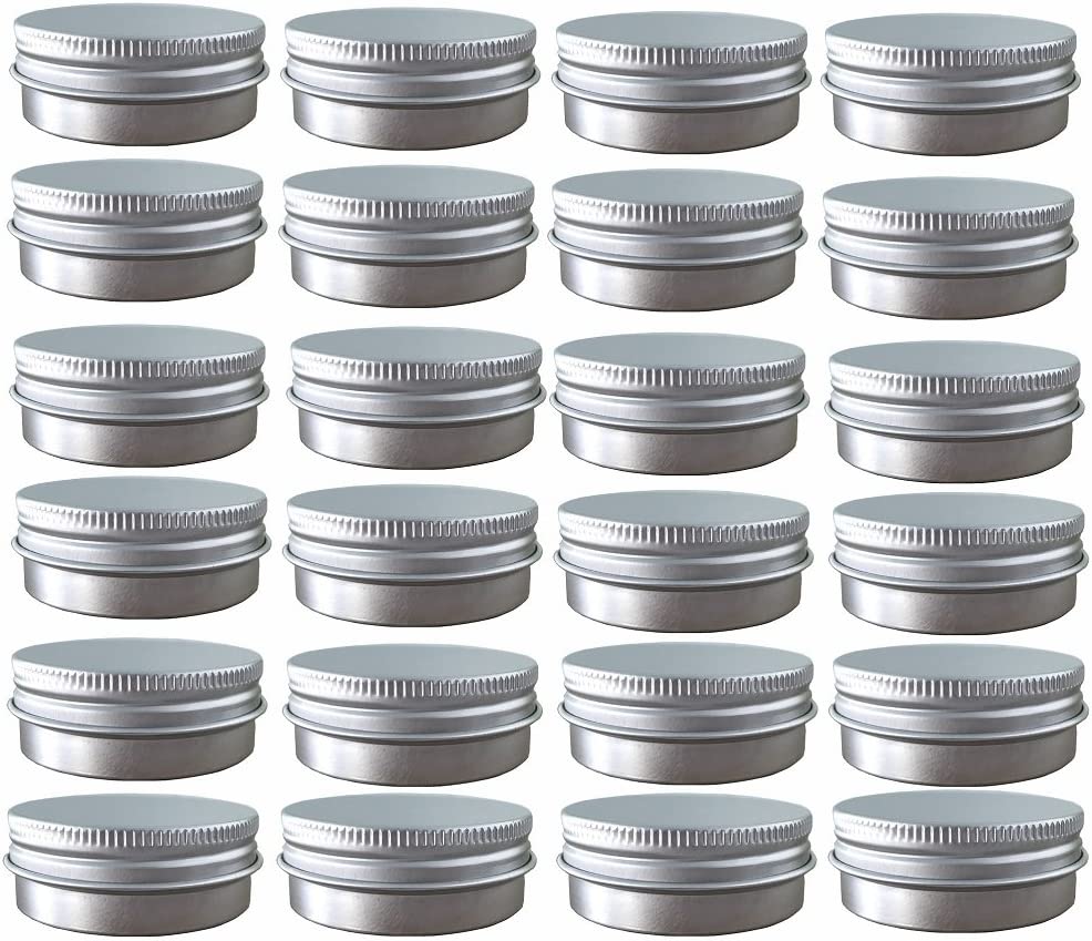 79in(H) 24pcs Jars including 24pcs Screwtop Cover Use our high-quality, food-grade aluminum tin containers to safely contain all of your handmade lip and body balms, hand creams and salves, essential oils, ointments, medicinal herbs and waxes, spices and seasonings, tea candles, powders, loose leaf teas, glitter, potpourri, bath salts (not the bad kind), earrings and other small jewelry.