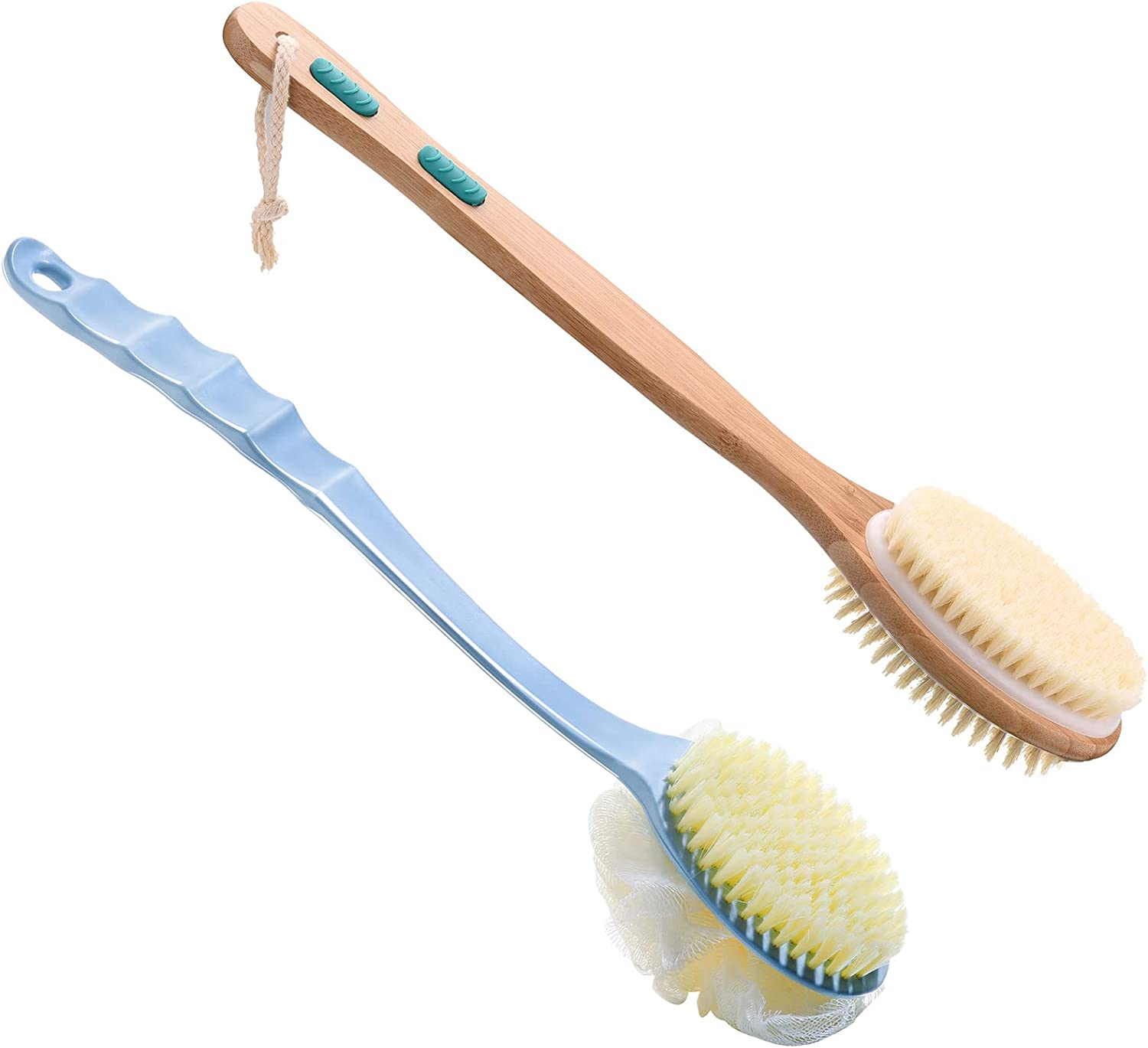 BRUSHES KIT:Pack with one bristle and loofah 2 in 1 shower back scrubber and one double side long handle bamboo brush. The bath brush set can be applied to the skin of different parts of the body.