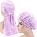 2Pcs/Set Durag And Bonnet Long Tail Satin Doo Rag Elastic Turban Sleep Cap Solid Color Light Purple