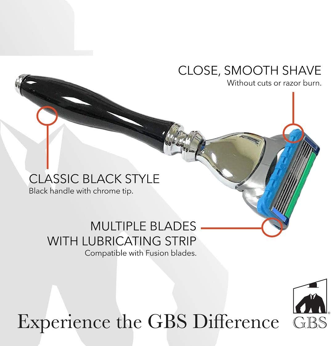 COMPATIBLE WITH REGULAR BLADES: G.B.S 5 Blade razor with black handle, it is perfect for close smooth shave without razor cuts or razor burn, it has classic black style black handle with chrome tip, it comes with multiple blades or with lubrication strip it is also compatible with Regular blades.