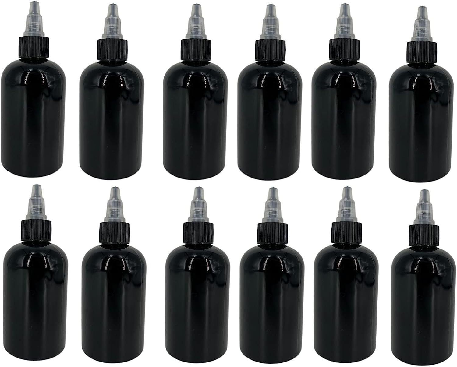 Specifications: Material: Plastic Quantity: 12 pack/set Shape: Boston Round Packaging: 12 pieces X 4 oz Black plastic bottle with black/natural twist top cap