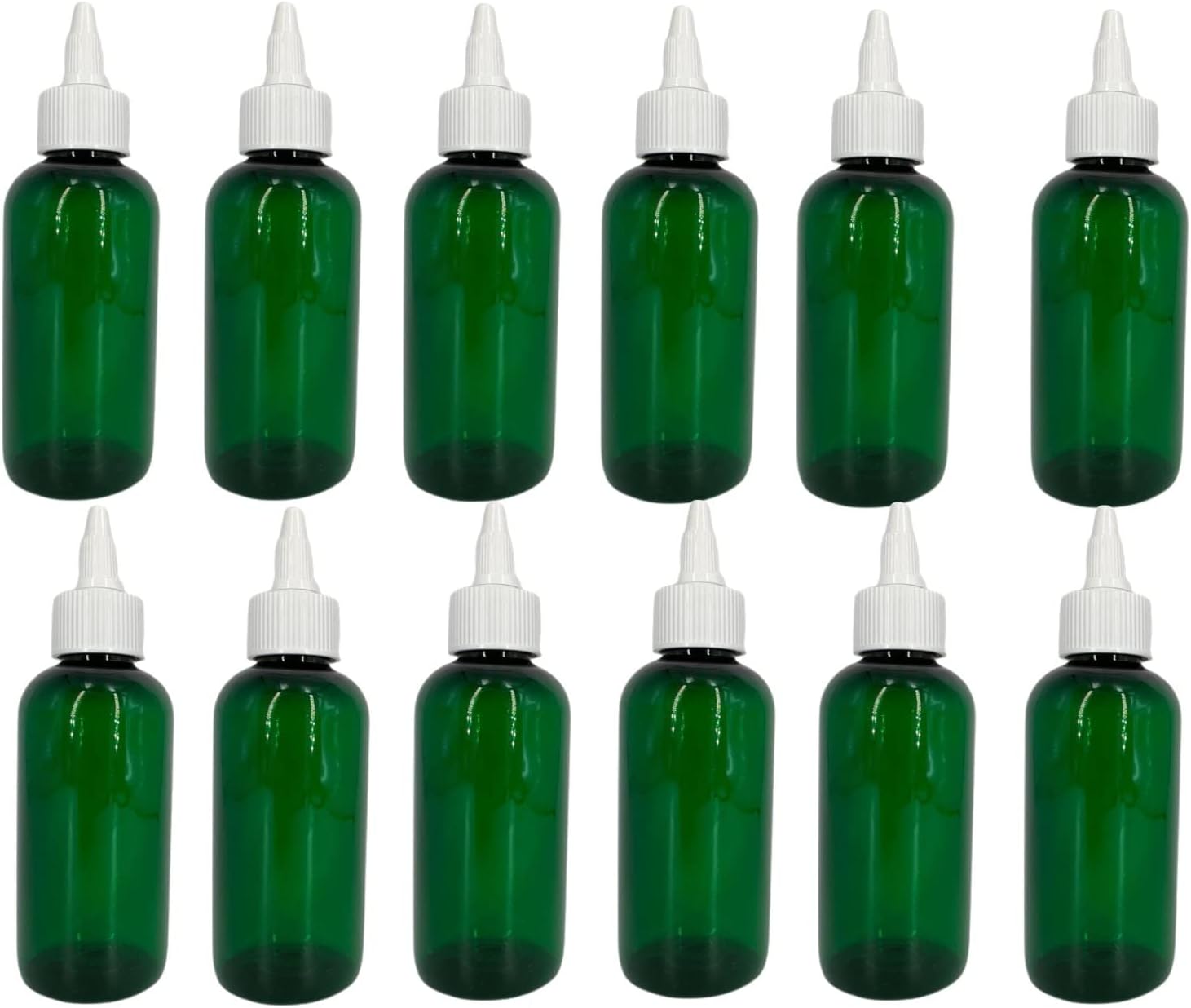 Specifications: Material: Plastic Quantity: 12 pack/set Shape: Boston Round Packaging: 12 pieces X 4 oz green plastic bottle with white twist top caps.