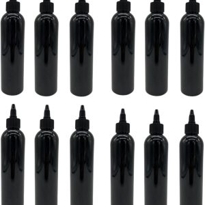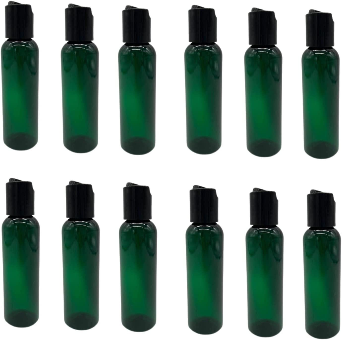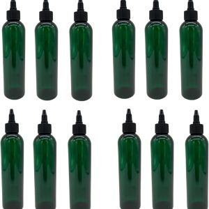 Specifications: Material: Plastic Quantity: 12 pack/set Shape: Cosmo Round Packaging: 12 pieces X 4 oz green plastic bottle with black flip top snap cap