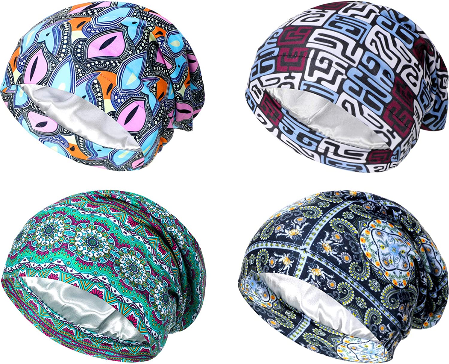 4 Pieces Satin Lined Sleep Cap Double Layer Silk Sleeping Bonnet Slouchy Beanie Slap Hat For Women Curly Hair(Blue Lattice, Green Stripe, Blue And Pink, Navy) At Women’S Clothing Store