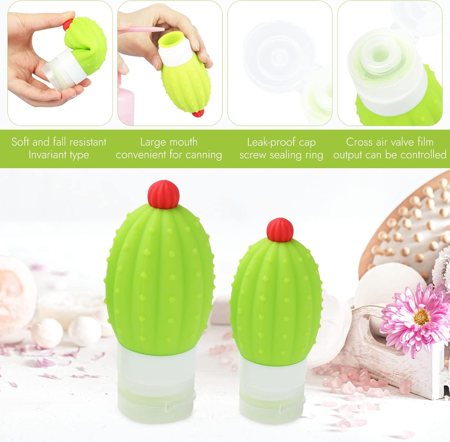 These travel bottle sets come in two different sizes for you to use and has a cute cactus design that makes it easy and fun to help sort the contents of the bottle.