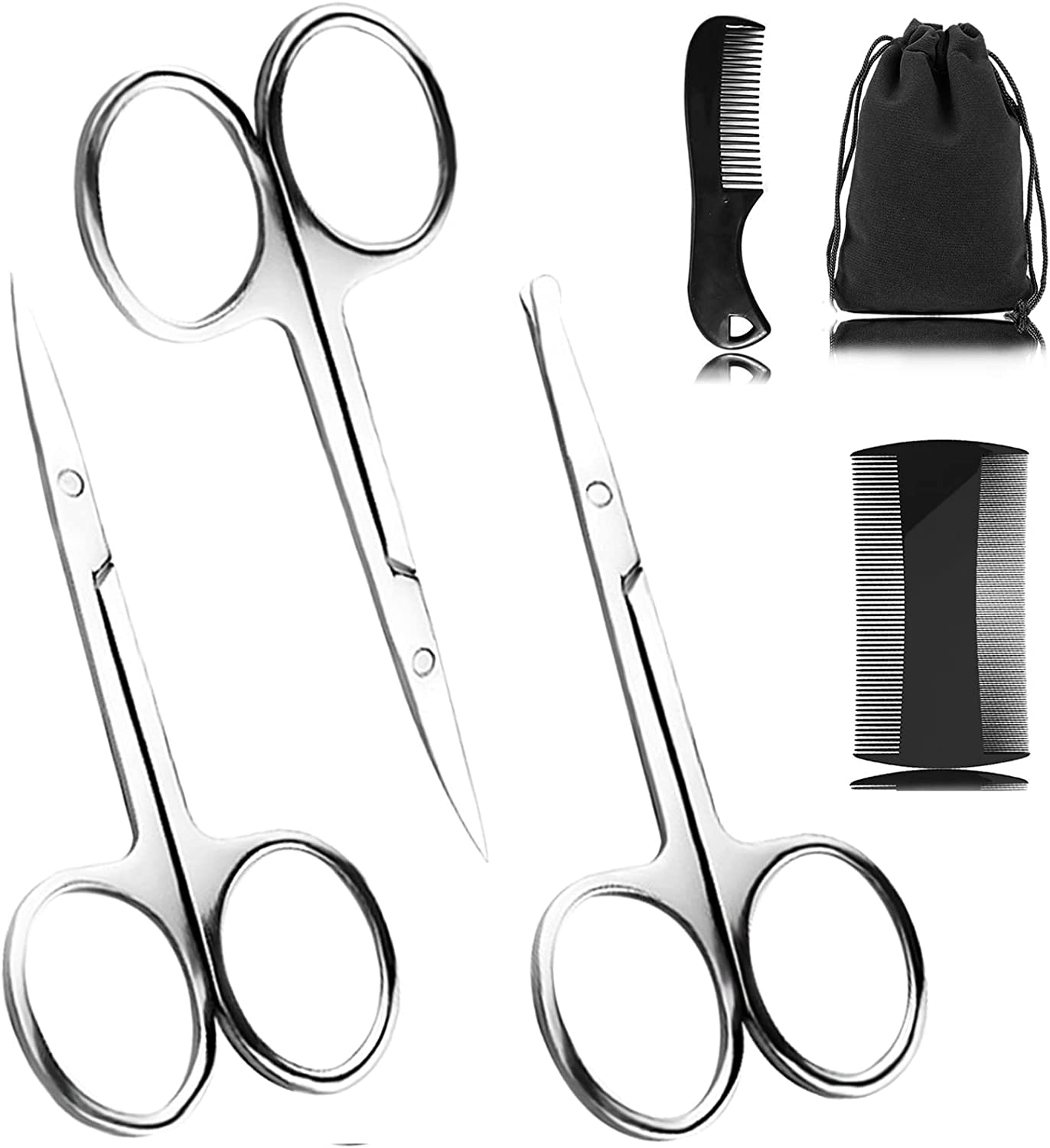 6 Pcs Facial Hair Scissors Set for Men, Curved and Rounded Beard Scissors Set With Combs & Pouch Beard Vibrissac Scissors For Styling of Mustache, Cutting, Grooming