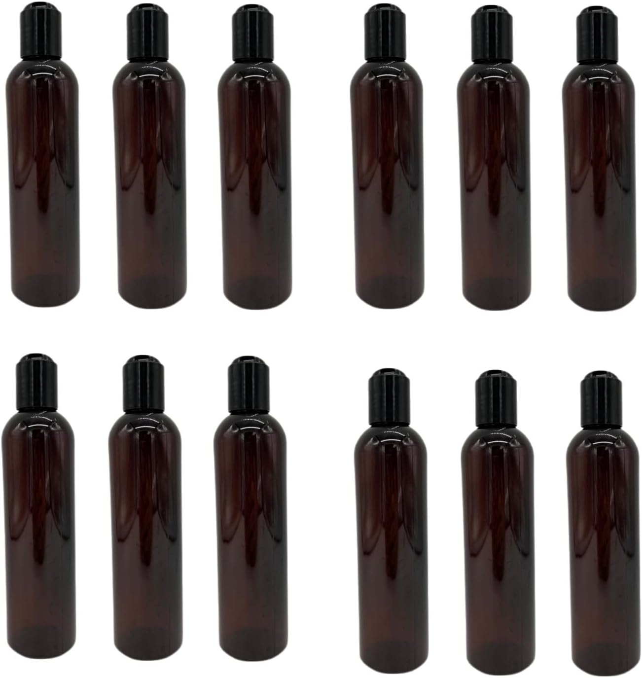 Uses: 8 oz Amber Plastic bottle with black press down disc caps are the perfect portable addition to your household cleaning supplies.