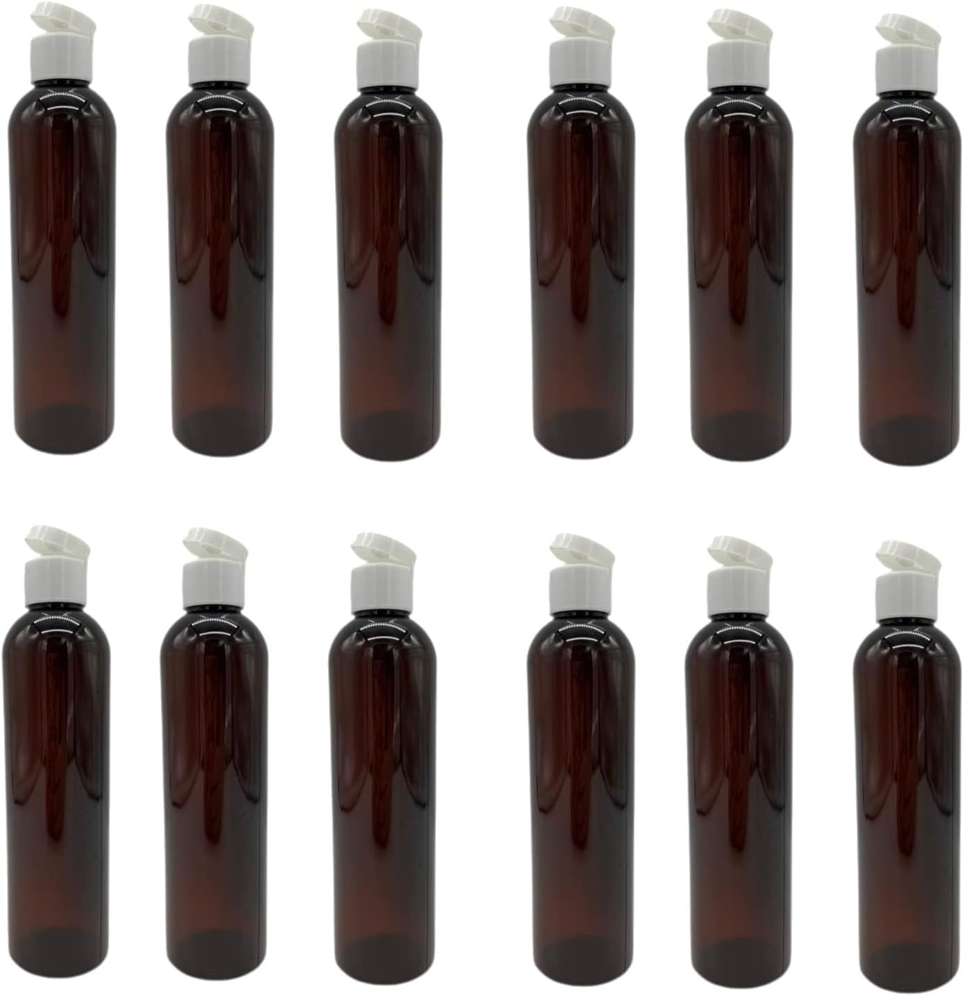 Specifications: Material: Plastic Quantity: 12 pack/set Shape: Cosmo Round Packaging: 12 pieces X 8 oz amber plastic bottle with white flip up snap top cap.