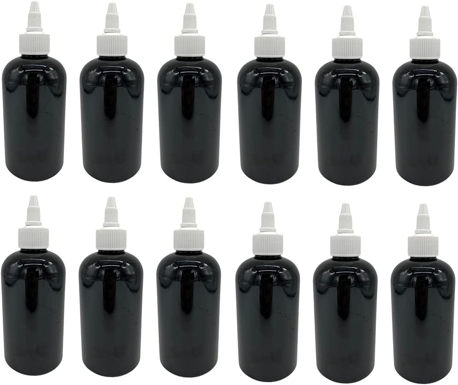 Specifications: Material: Plastic Quantity: 12 pack/set Shape: Boston Round Packaging: 12 pieces X 8 oz black plastic bottle with white twist top caps.