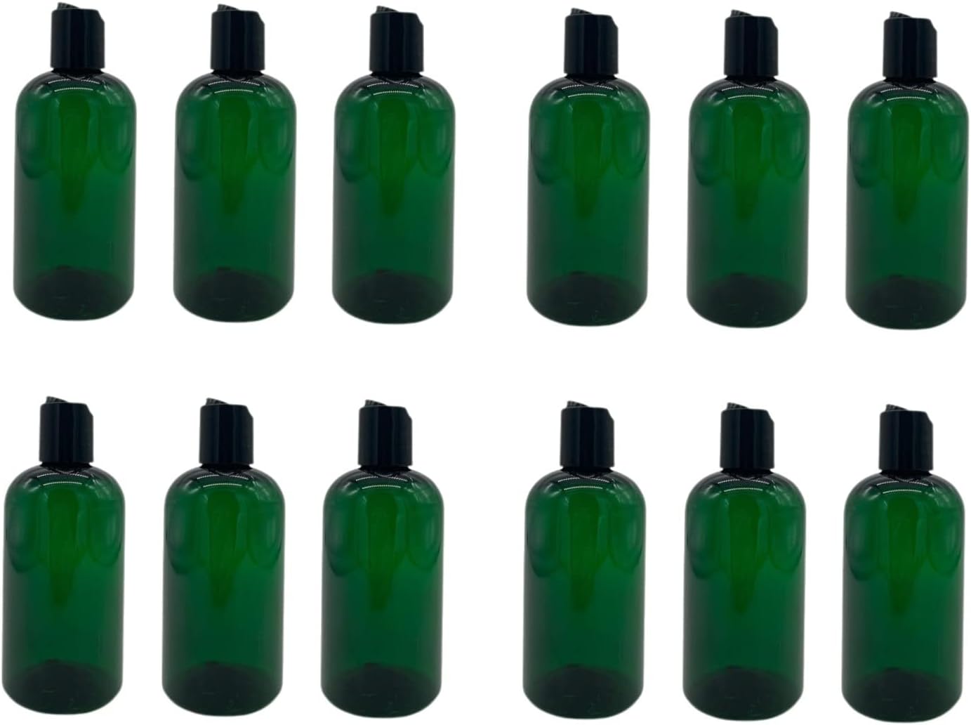 Specifications: Material: Plastic Quantity: 12 pack/set Shape: Boston Round Packaging: 12 pieces X 8 oz green plastic bottle with black press down disc caps.