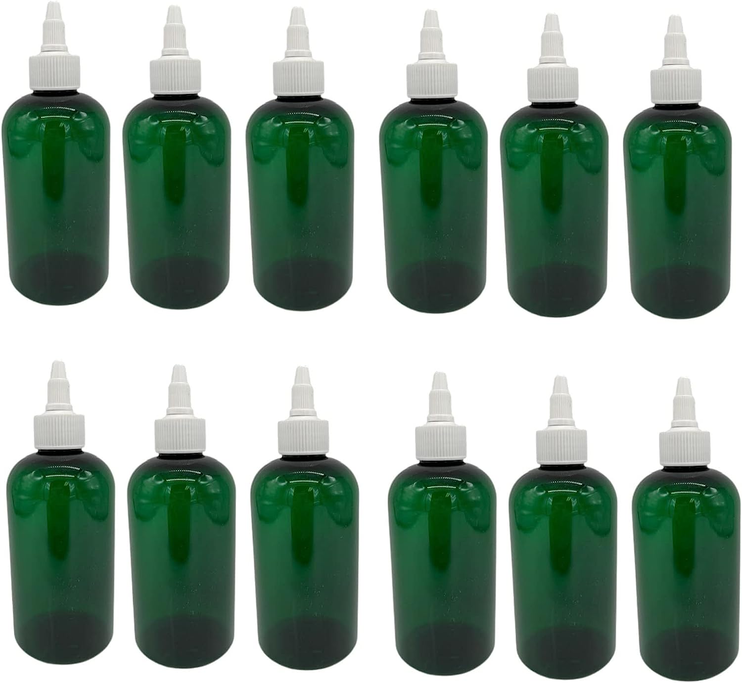 Specifications: Material: Plastic Quantity: 12 pack/set Shape: Boston Round Packaging: 12 pieces X 8 oz Green plastic bottle with white twist top caps.