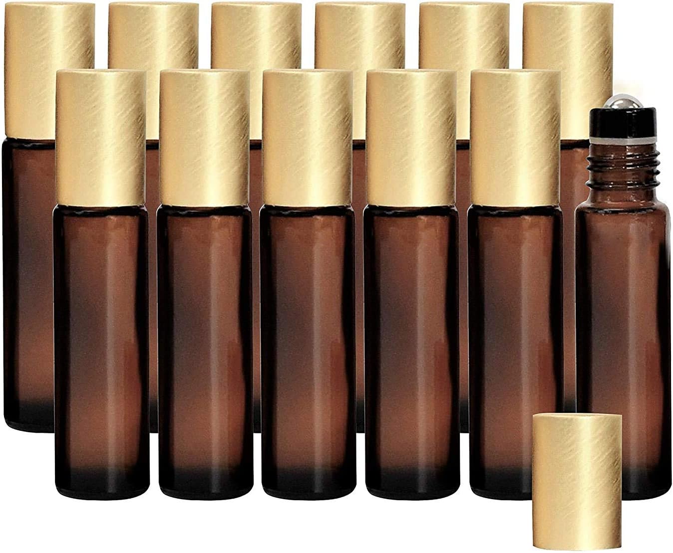 Amber Glass Essential Oil Roller Bottles with Leakproof Stainless Steel Roller Ball Oil and Gold Caps for Essential Oils, Travel, Perfume, Lip Gloss, Blends – 12 pack