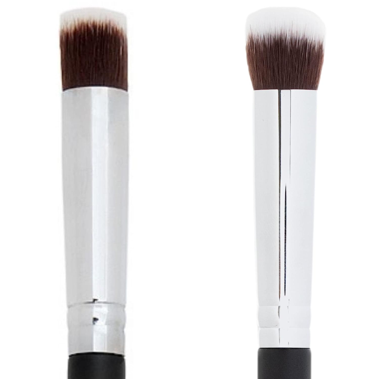 – Angled: Perfect for applying blush, the soft angle deposits just the right amount of pigment to the cheek for either a soft or dramatic look.