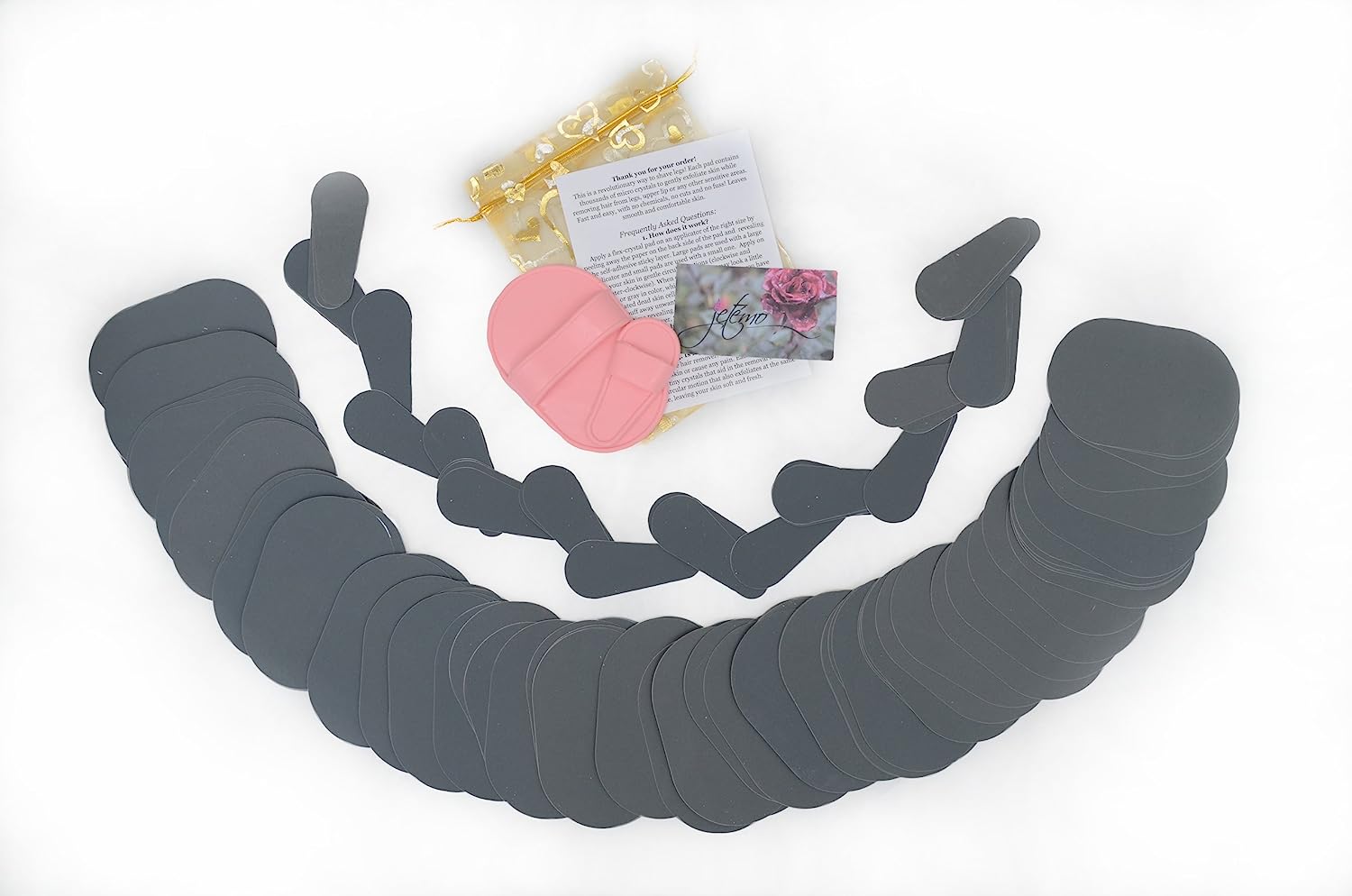 SET INCLUDES: 2 Applicator (1 Large + 1 Small), custom quantity of Replacement Pads (please choose 8, 16, 40, 100 or 200), clear plastic packaging, organza travel bag (colors may vary), instruction.