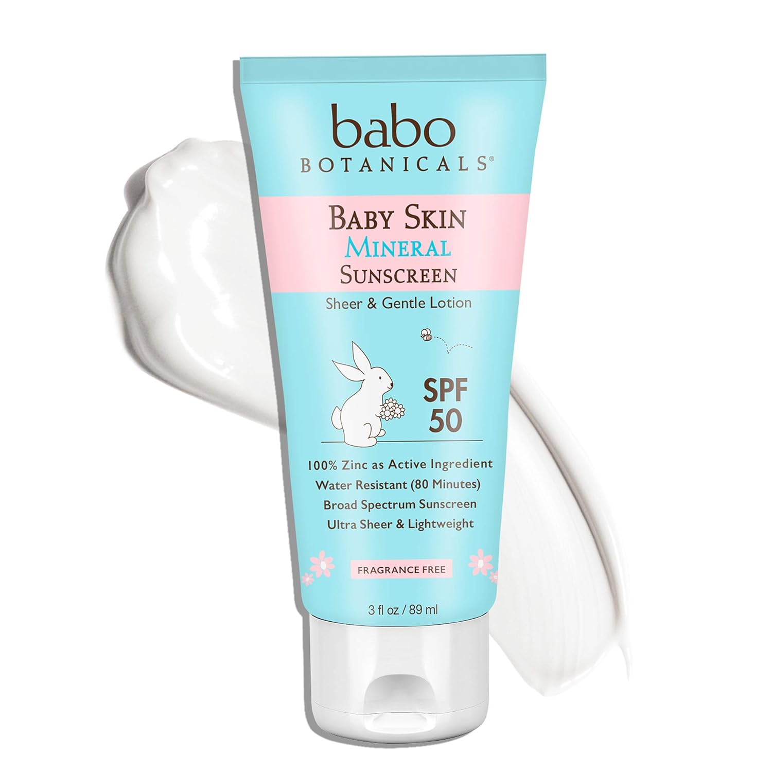 Babo Botanicals Baby Skin Mineral Sunscreen Lotion SPF 50 with 100% Zinc Oxide Active, Non-Greasy, Water-Resistant, Reef-Friendly, Fragrance-Free, Vegan – 3 oz.