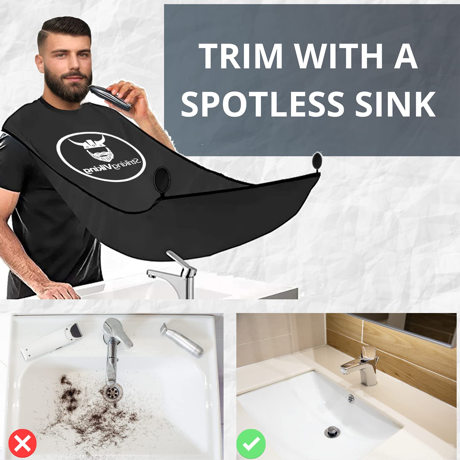 Attach Beard Apron around your neck then suction the other end to your mirror. Start shaving and clipping and the hair collects in the bibs catcher area. After, easily dispose the hair without any extra cleanup