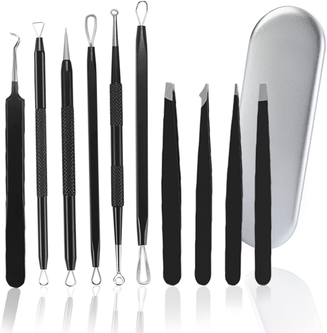 Blackhead Remover Pimple Popper Tool Kit,Tweezers Set 10pcs Great Function: Blackhead Extractor tool for Face can help to remove blackheads, acne and various blemishes, keep your face clean and smooth without redness or scar。 Best Precision Tweezers Set for Shaping Eyebrows, Great Beauty Tools for Facial Hair, Well-groomed eyebrows frame your eyes and highlight your features, so crafting the perfect arch 。 How to use a blackhead remover tool Step 1: Clean face with warm water, and hold a warm face cloth to the area for a few seconds to open up the pores。 Step 2: Disinfect tools and your hand with alcohol or hot water。 Step 3: Gently press down on one side of the blackhead, move the tool across the top, youshould be able to feel the tiny pressure when forces the blockage out, you will need to adjust the。 angle, use the edge of the loop and ease it out, again ”scraping” across the top。 Step 4: Cleanse your skin again, then apply toner and moisturizer。 Step 5: Disinfect with cotton swap or anti-flammatory water。 Step 6: Clean and dry the tools before putting back into the organized case。 Note Tips: 1.