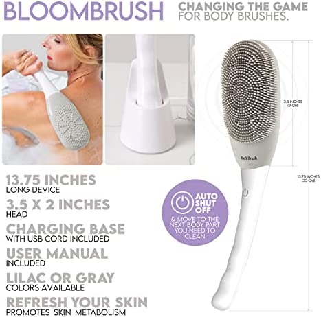 3 Speed Silicone Brush for Glowing Skin: How vigorous do you feel Choose your vibrations depending on whether you want a lymphatic drainage massager, facial scrub brush or general showering. Use the nodules for massage or the silicone body brush bristles for deep pore cleansing from head to toe!: USB Charging Cradle for Optimized Hygiene: Bloombrush is available in Lilac or Grey so you can choose the shower back scrubber to match your bathroom. It comes with a vertical cradle that keeps your body scrub brush upright so it dries fast, and always charged ready for your next skin brush session.