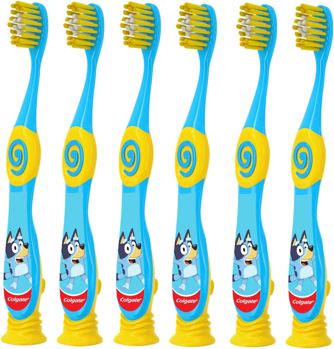 Designed for children ages 2+, the Colgate Bluey toothbrush features extra soft bristles for gentle and effective cleaning, a thumb grip and rounded handle for a comfortable grip, and a suction cup for easy and fun upright storage.