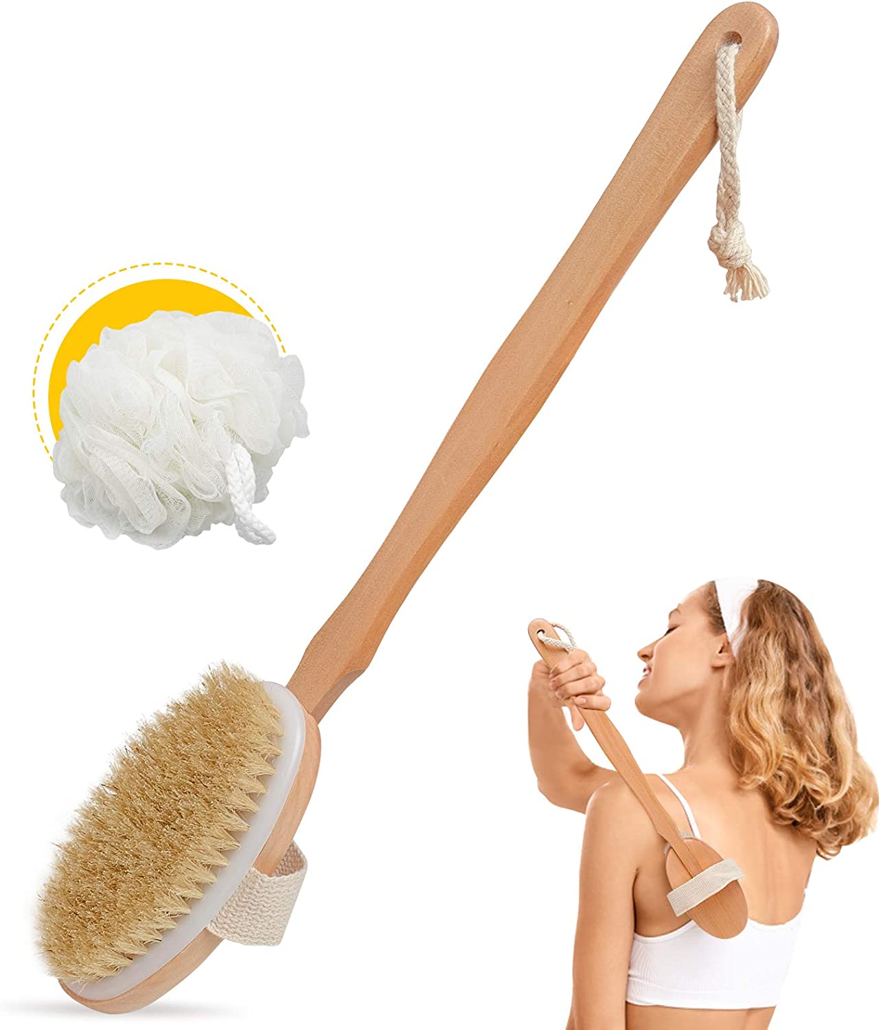 CLEAN SKIN: The natural bristle body scrub brush and sponge clean exfoliating and cellulite to make the skin smooth and healthy with shower gel or scrub