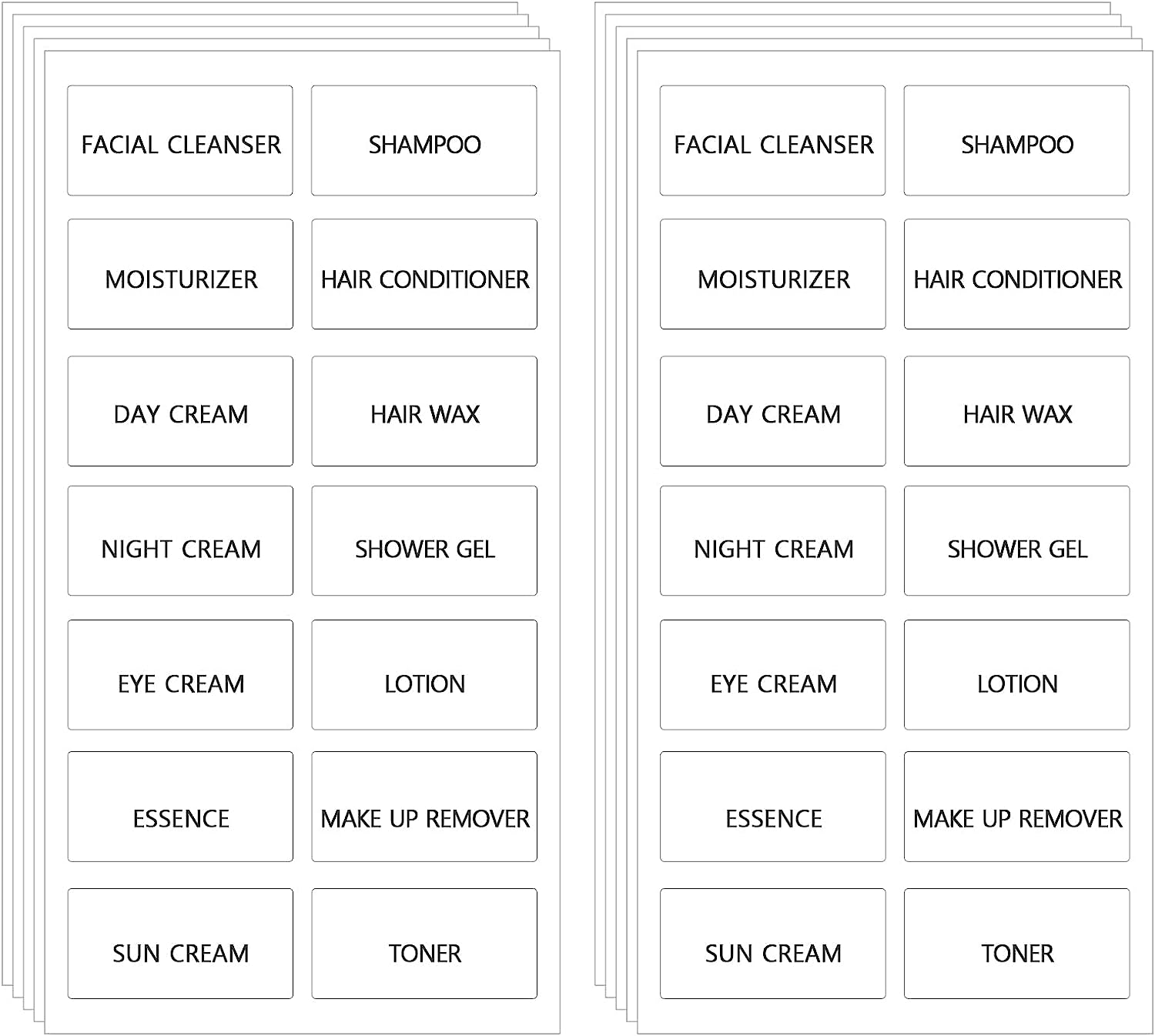 Label ContentThe cosmetic dispenser sticker label includes the names of 14 skin care products including facial cleanser, moisturizer, day cream, night cream, eye cream, essence, sun cream, shampoo, hair conditioner, hair wax, shower gel, lotion, makeup remover, and toner