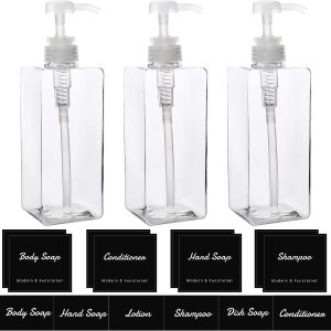 • MULTI-FUNCTIONAL – Our refillable pump bottle dispenser and waterproof stickers can be used to hold different liquids, such as shampoo, conditioner, body wash, lotion, body cream, massage oil, hair oil, liquid soap, hand soap, face wash , facial cleanser, dish soap, etc. It is suitable for daily use, bathroom, bedroom, office, kitchen sink, travel, vacation, also great for commercial use, laundry room, beauty salon, hotel, restaurant, SPA.