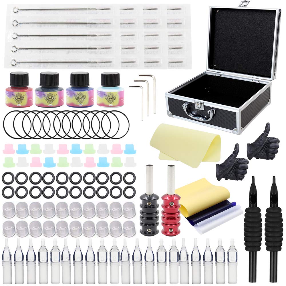 • PROFESSIONAL TATTOO ACCESSORIES – 20pcs high-grade tattoo needles and 20pcs tattoo tips, 2pcs disposable grip, 2pcs stainless steel tattoo grips, 20pcs ink caps,1 set of adjust tools, 4 colors tattoo ink each bottle 5ml , 1pcs tattoo practice skin, 1 tattoo kit case and more accessories for you. High performance tattoo kit,make easy tattooing,great for practice.