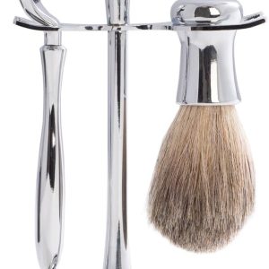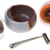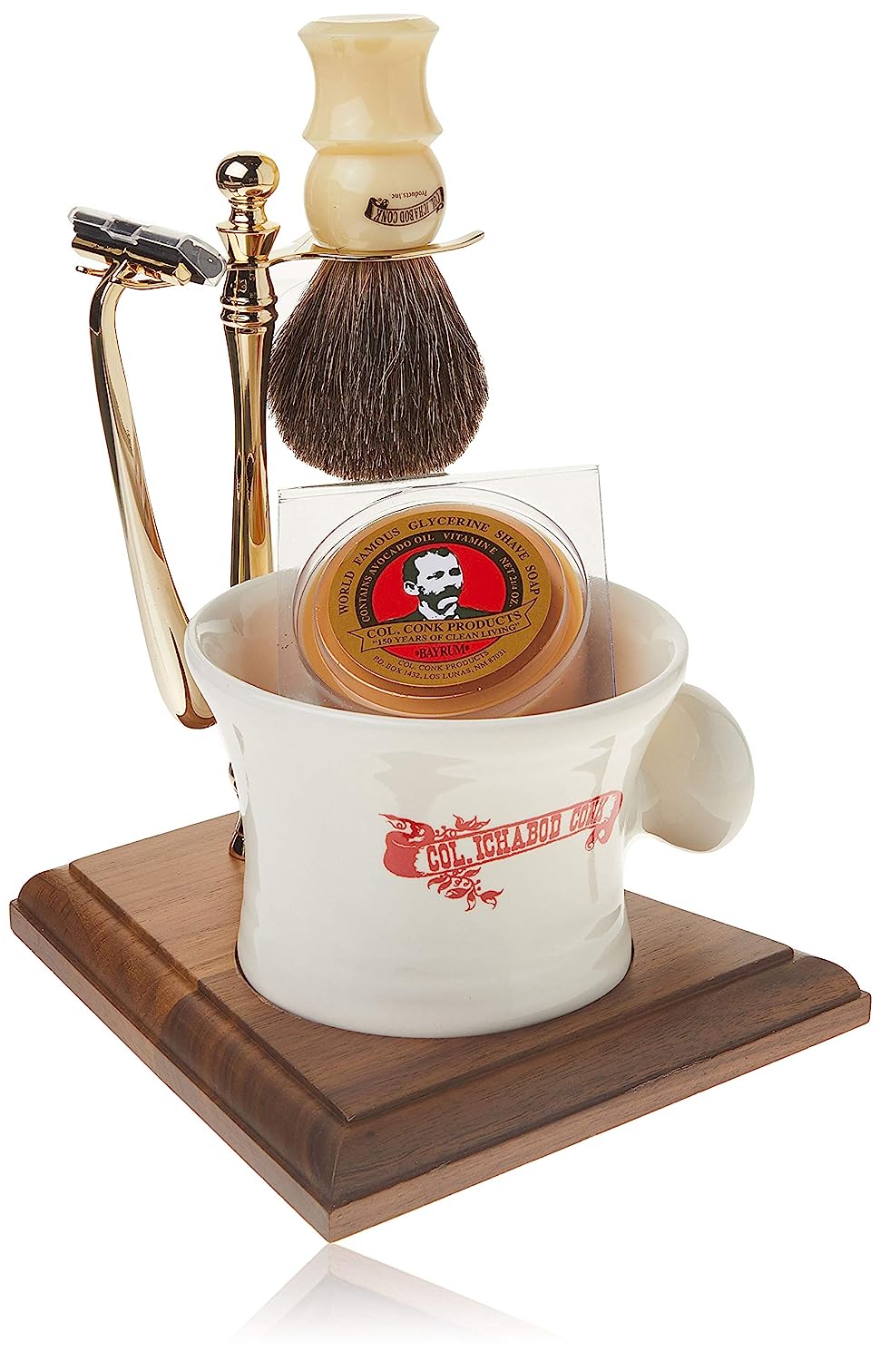 This classy five-piece set has a hardwood base and a gold-toned stand for razor and brush when not in use, gold-tone double track razor, mixed badger brush, a ceramic apothecary mug and Colonel Conk”s world-famous glycerin shave soap.