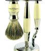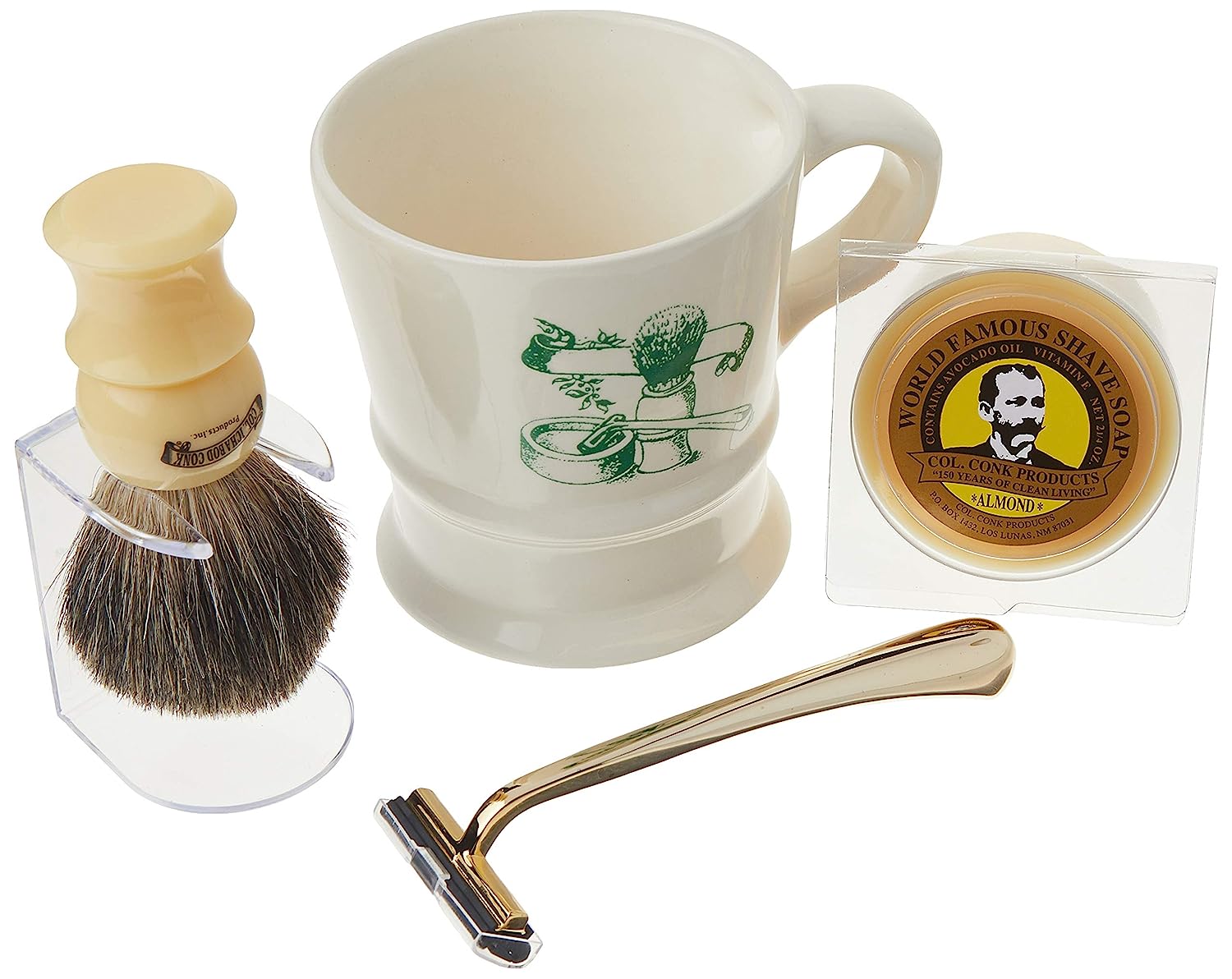 This handy set includes Colonel Conk”s world-famous glycerin shave soap, a soft and luxurious mixed badger shave brush, a gold-tone double track razor and Colonel Conk”s old-fashioned ceramic mug for lather.