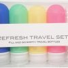 It contains 15 pack travel toiletries containers with 5 colors and 5 spatulas, you can identify the contents of each piece by color or using the attached label.