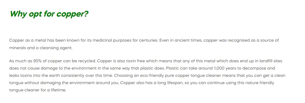 Copper is the ideal material for dental care; simply rinse with clean water after each usage; copper only has to be washed with ordinary soap on occasion to stay clean.