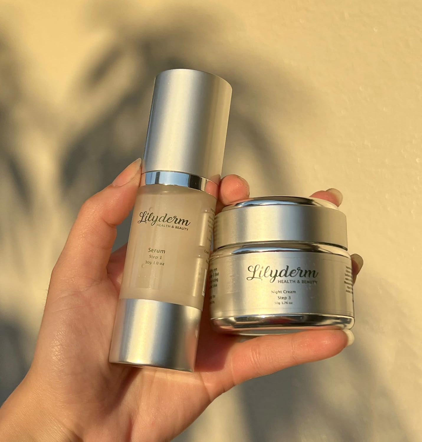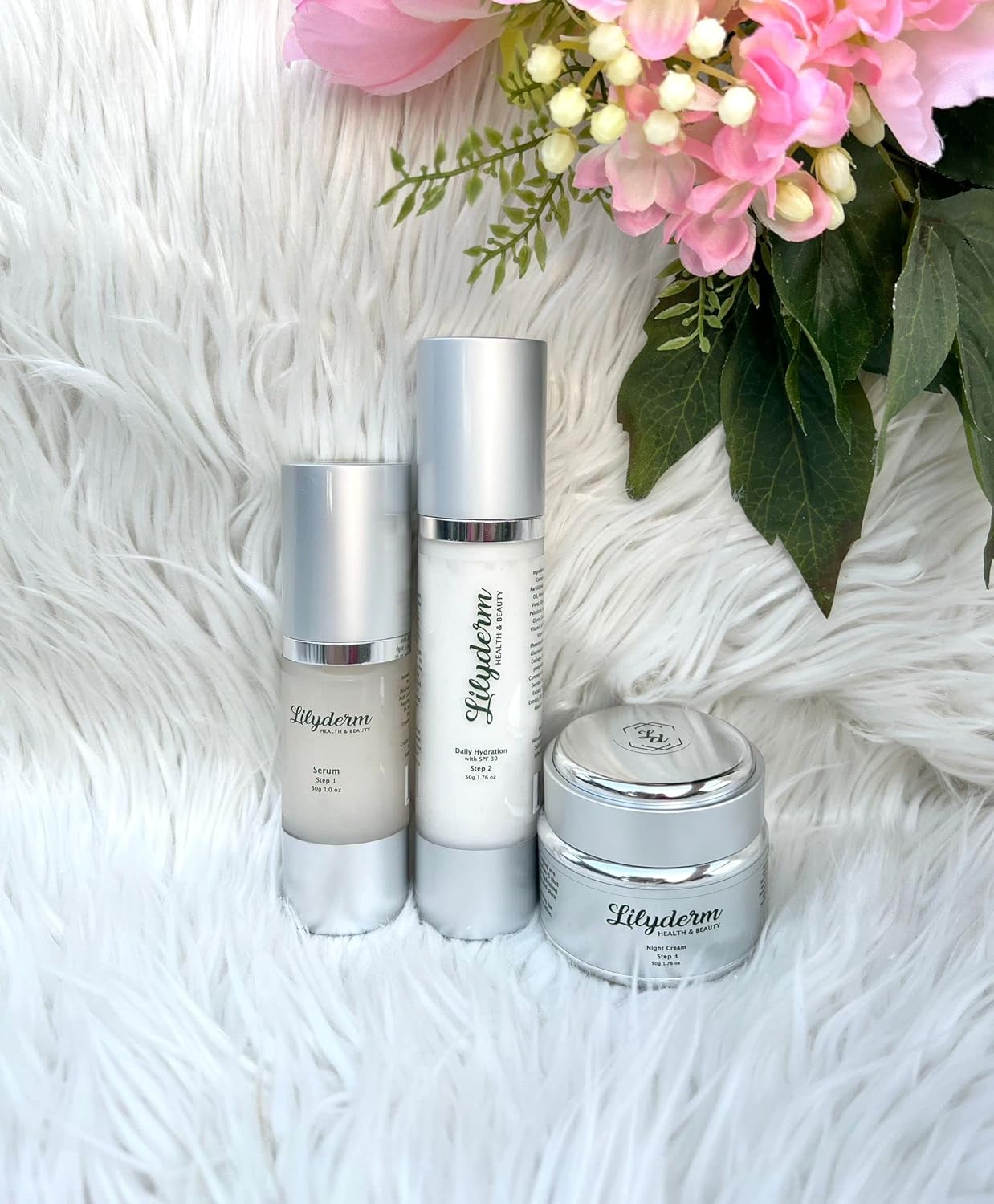 Cosmetic Routine in three steps, Serum-Daily Hydration-Night Cream that keeps the skin hydrated and protected 24 hours, reducing dark spots, skin aging, and expression lines.