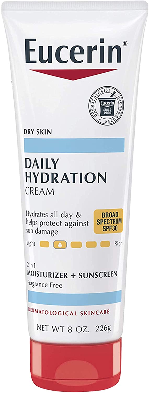 Eucerin Daily Hydration Cream SPF 30 provides 24 hour moisture to dry skin while protecting it from sunburn and long-term skin damage with Broad Spectrum UVA/UVB protection.