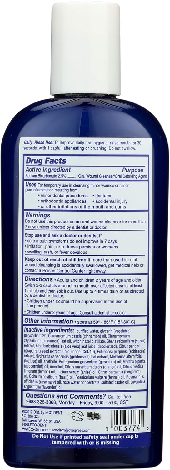 Sodium Bicarbonate 2.5% Purpose Oral Wound Cleanser/oral Debriding Agent Purified Water, Glycerin (Vegetable), Polysorbate 20, Cinnamomum Cassia (Cinnamon) Oil, Cinnamomum Zeylanicum (Cinnamon) Leaf Oil, Witch Hazel Distillate, Stevia Rebaudiana (Stevia) Extract, Aloe Barbadensis (Aloe Vera) Leaf Juice (Decolorized), Citrus Paridisi (Grapefruit) Seed Extract, Ubiquinone (Coq10), Echinacea Purpurea (Echinacea) Extract, Hydrastis Canadensis (Goldenseal) Leaf Extract, Melaleuca Alternifolia (Tea Tree) Oil, Anethole, Pelargonium Graveolens (Geranium) Oil, Mentha Piperita (Peppermint) Oil, Menthol, Citrus Aurantium Dulcis (Orange) Oil, Citrus Medica Limonum (Lemon) Oil, Illicium Verum (Anise) Oil, Citrus Bergamia (Bergamot) Oil, Ocimum Basilicum (Basil) Oil, Foeniculum Vulgare (Fennel) Oil, Rosmarinus Officinalis (Rosemary) Oil, Rose Water Concentrate, Sulfated Castor Oil, Lavandula Angustifolia (Lavender) Oil