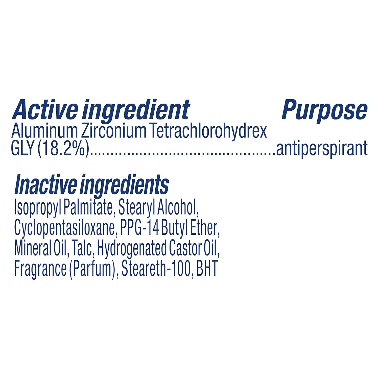 Cyclopentasiloxane, Isopropyl Palmitate, Stearyl Alcohol, Mineral Oil, Talc, Hydrogenated Castor Oil, Fragrance (Parfum), Steareth-100, Bht.