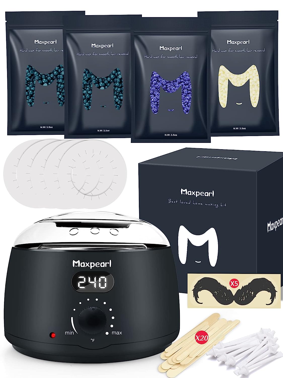 • HARD WAX KIT FOR HOME USE: hair removal waxing kit contains everything you need to create your own mini waxing studio at home, including a digital wax machine, 4 bags non strip wax beads and 20pcs wooden spatulas-10pcs for small areas, 10pcs for large areas. They are great for both beginners and estheticians.