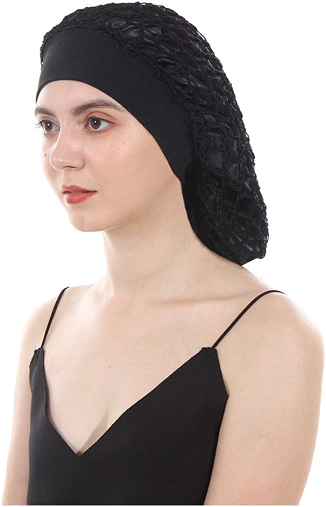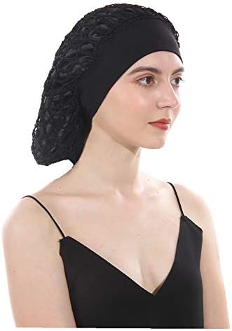 Duozan Vintage Elastic Wide Band Snood Bonnet Double Layered Hair Net Night Sleep Hat Crocheted Slouchy Beanie (Black)