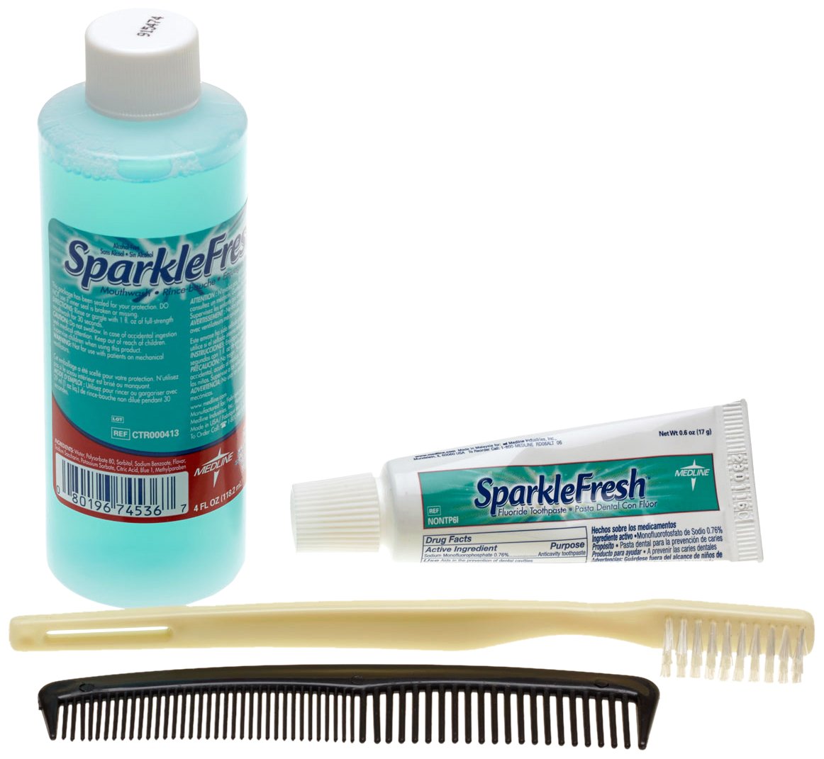 ”s Personal Care Kit includes: 1 ea Comb, 5″ (13 cm); 1 ea Mouthwash, Alcohol-free, 4 oz (118 ml); 1 ea Toothbrush, Adult, Individually Wrapped, 30 Tuft; and 1 ea Toothpaste, Fluoride.