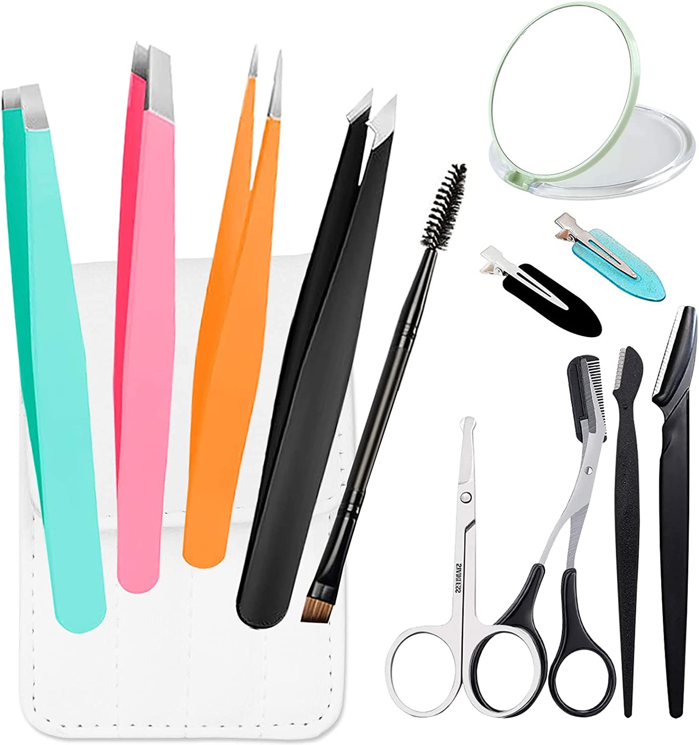 12 in 1 Complete Eyebrow Grooming Kit:SOYE Eyebrow Kit includes 4 x different eyebrow precision tweezers,1xDouble eyebrow brush,2xeyebrow razor,2x different eyebrow scissors,1xMirror,2xNo Bend Hair Clips. Our tools can provide you with a professional eyebrow trimming experience,Each tool has a different color, which can make you feel different happy moods when trimming your eyebrows.