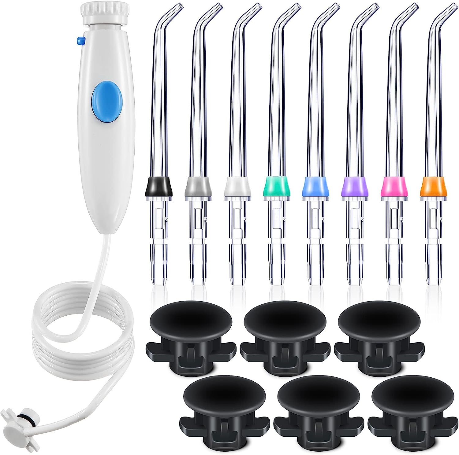 Specifications:Material: ABS resin Color: as shown in the picture Size: as shown in the picture Package includes:6 x Tank Valve Rubber Gasket for Water Flossers1 x Replacement Hose Compatible with Waterpik 8 x Replacement TipsNotes:Manual measurement, please allow slight errors on size.