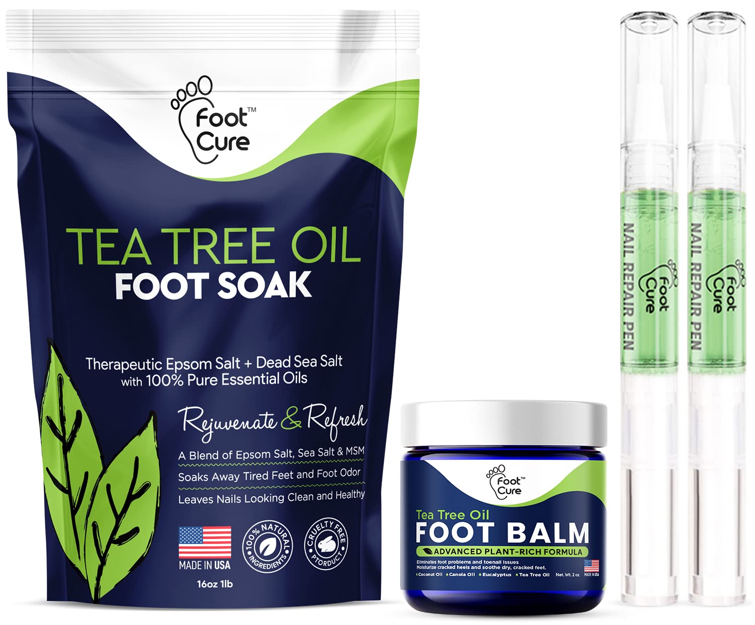 A Proven 3 Step System For Your Feet & Nails: Our intensive nail and foot repair kit has everything you need to quickly rejuvenate, and hydrate your feet, fingernails, and toenails; You”ll receive a bag of (Tea Tree Oil Foot Soak Salts), our Tea Tree Oil Foot Balm, and (2) Nail Repair Pens