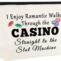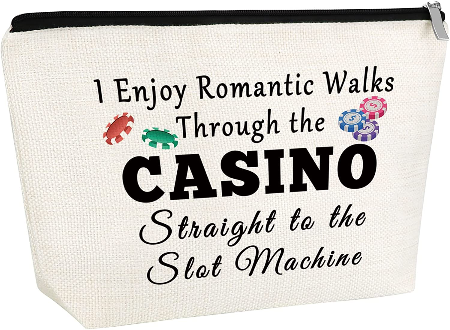 Gambler Gift:This gifts for gambling lovers makeup bag print with”I Enjoy Romantic Walks Through The Casino, Straight To The Slot Machine”.Keep Lady Luck by your side by this casino makeup bag. The perfect gift for the gambler or gamester in your life.By this bag to the casino for good luck or even to play bingo.