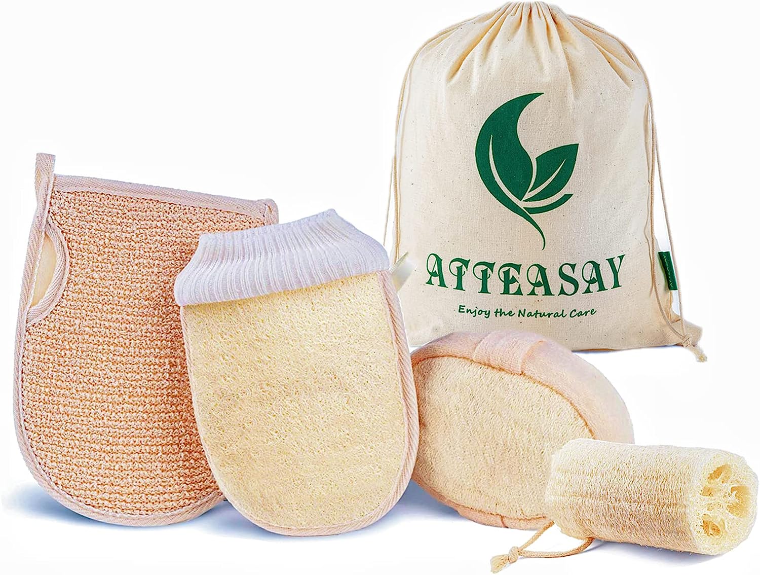 Complete 4-Pack of High-Quality Natural Loofah Sponges This 4-pack set includes 2 loofah exfoliating gloves, 1 Loofah pad body scrubber, 1 Loofah Sponge Body Scrubber all made from high-quality natural loofah that is gentle on the skin.