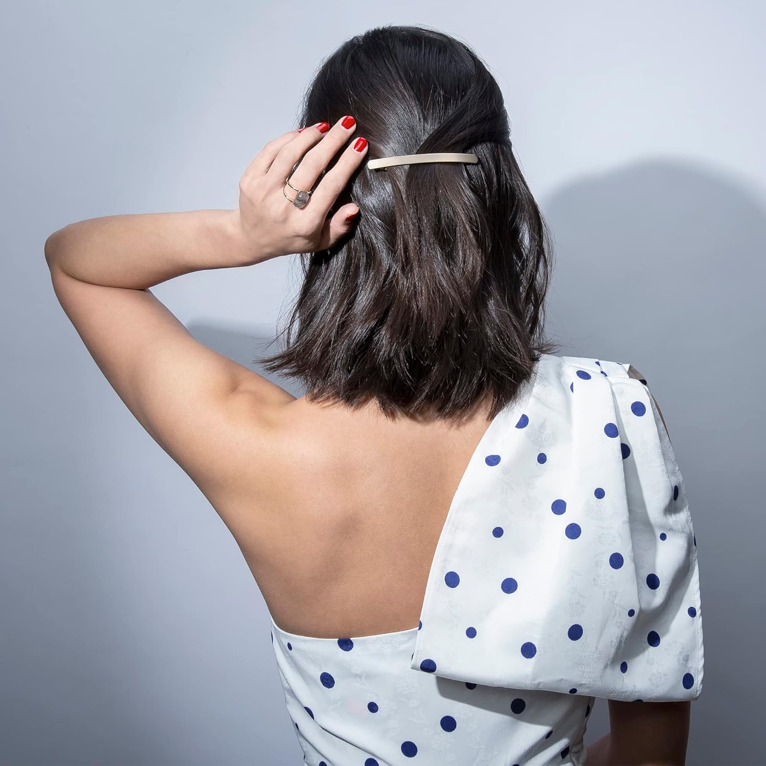 Enhance the classic half-up hairstyle by clipping in this sophisticated gold barrette with a subtle metallic shimmer.